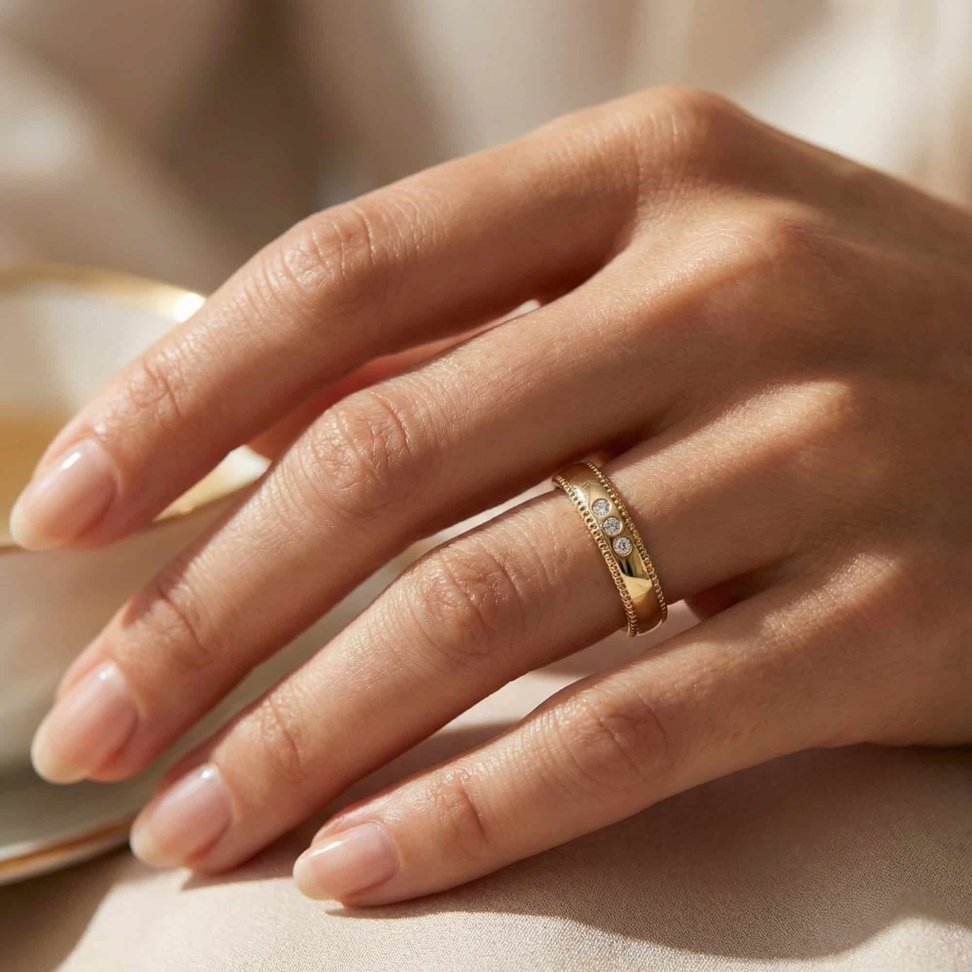 Alliance or jaune 14 carats perlée et diamants qui affiche un style classique tout en étant singulière de part son travail de ciselures.