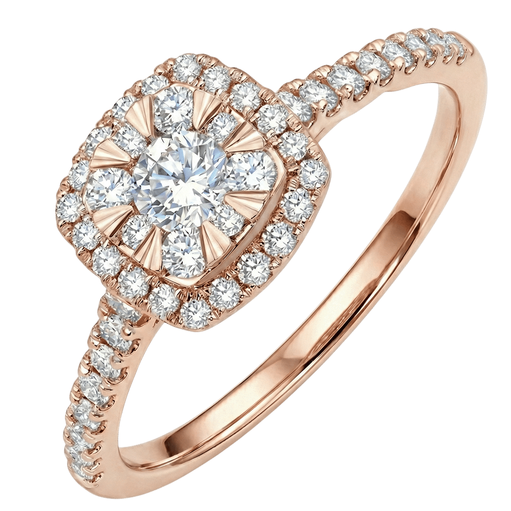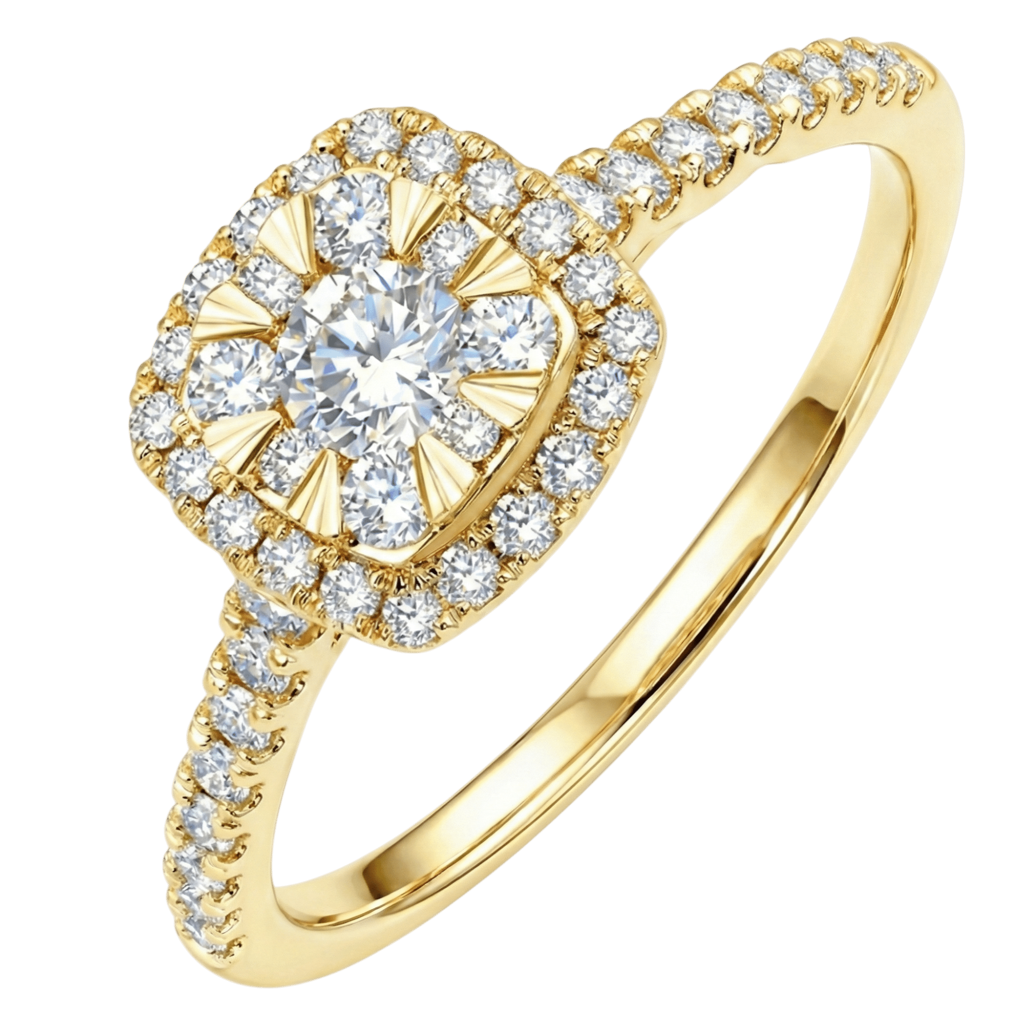Sur cette bague de fiançailles or jaune couronne carrée, la disposition des diamants au centre et sur les branches donne du caractère à ce magnifique bijou.