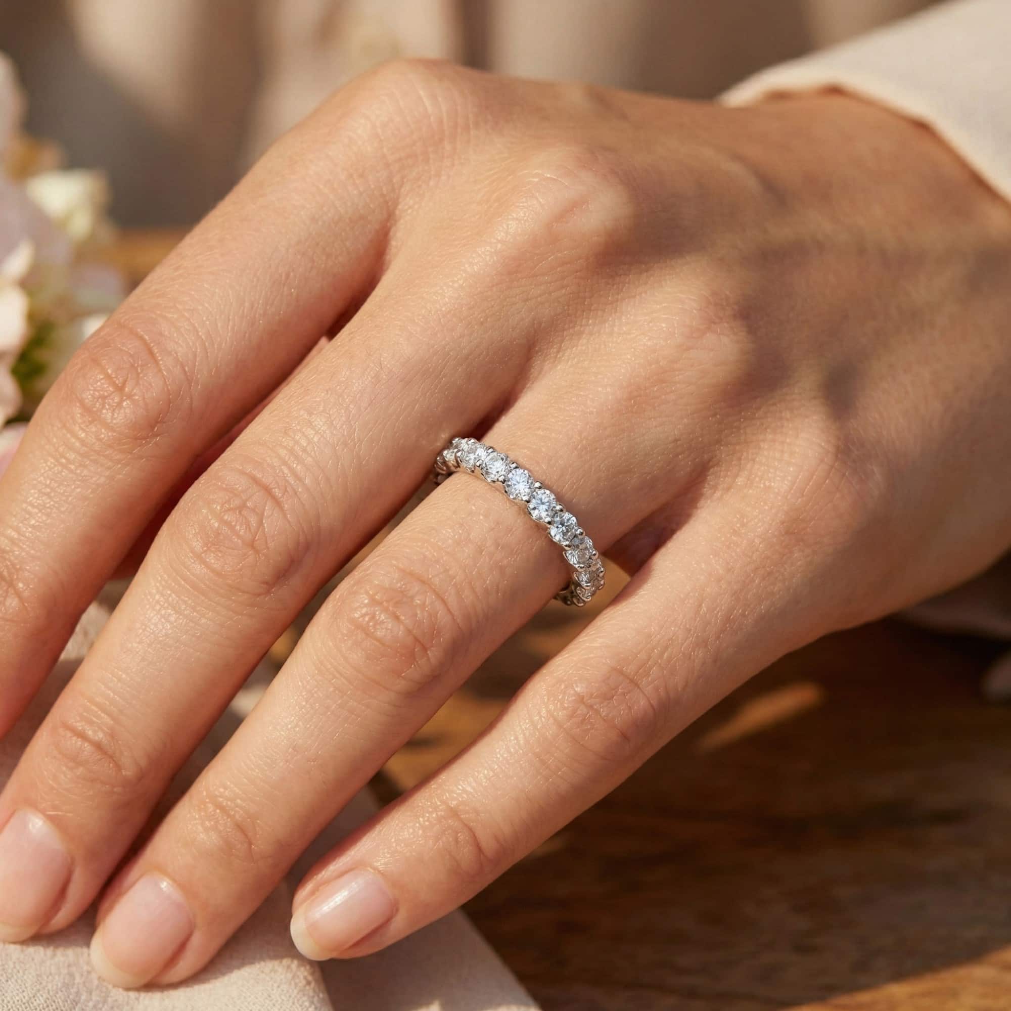 La technique du serti griffes surélève chaque pierre pour capter la lumière sous tous les angles et maximiser leur brillance naturelle. Fine et confortable, cette bague au design épuré s’accordera parfaitement avec votre bague de fiançailles ou se portera seule pour une touche d’éclat quotidien.