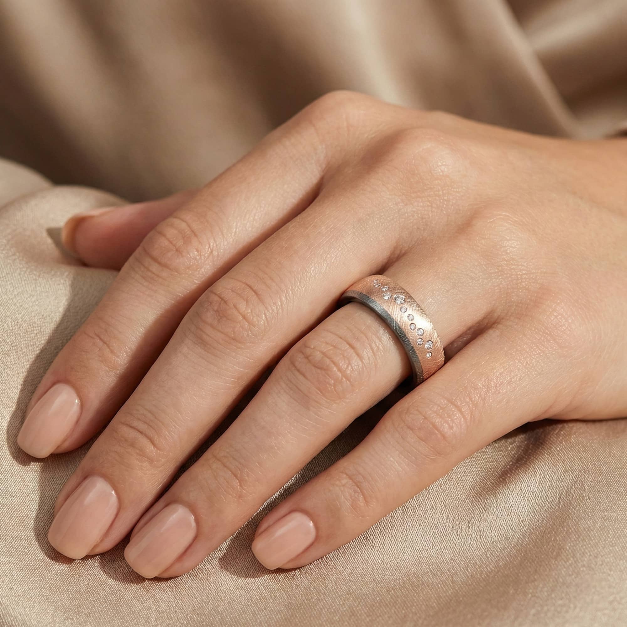 Cette bague de mariage en tantale et or rose est très originale !