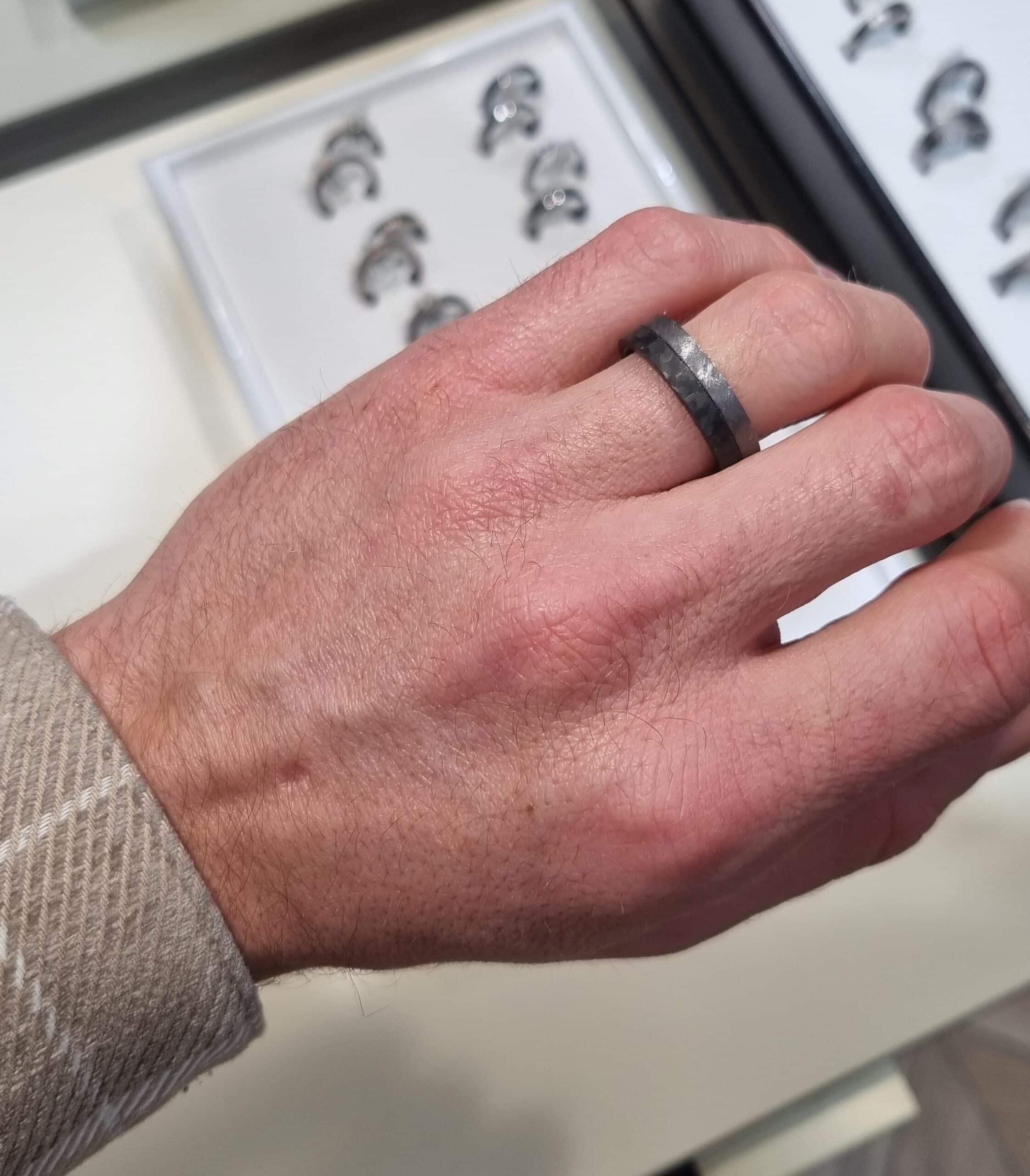 Magnifique alliance en carbone et tantale large épaisse et originale.